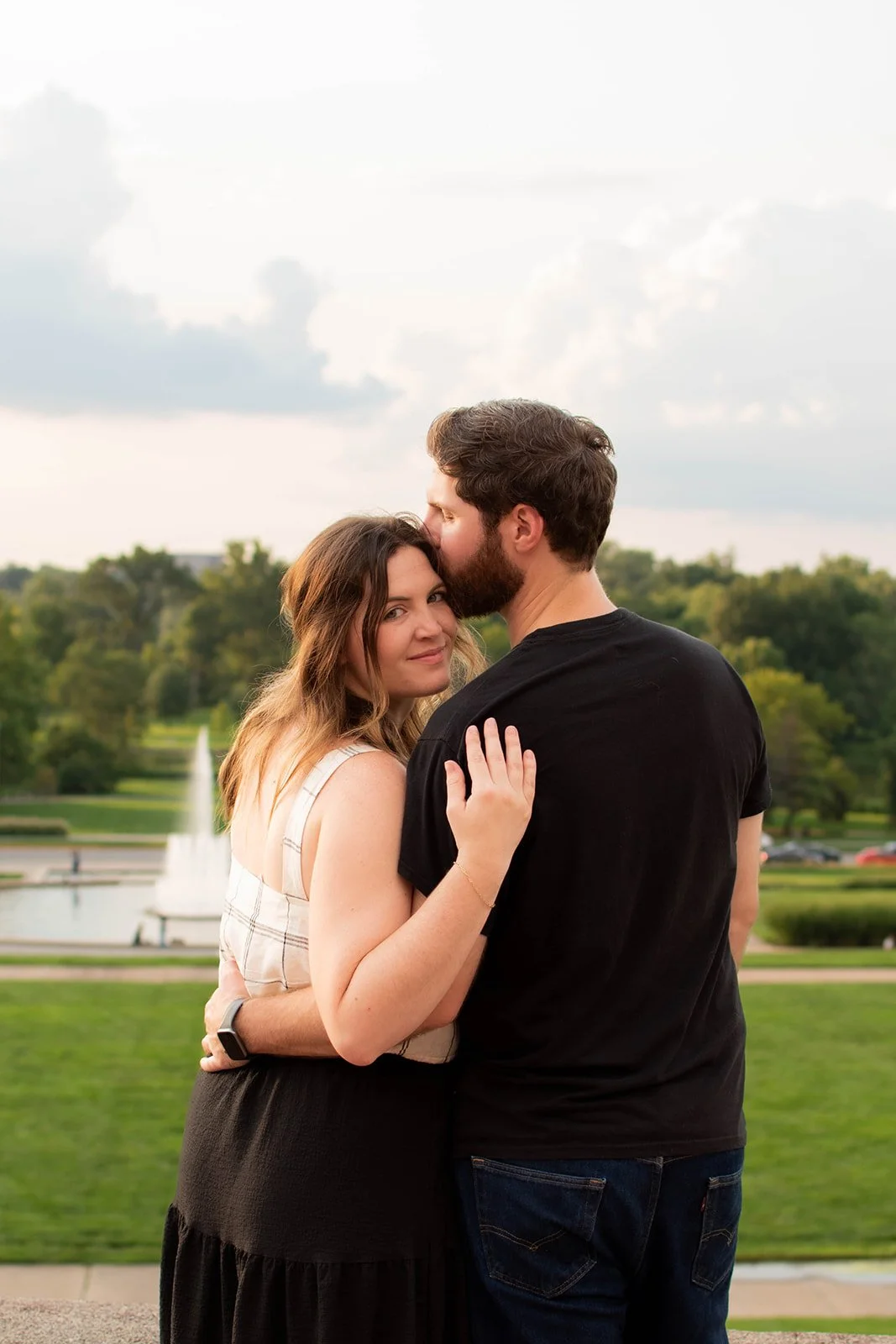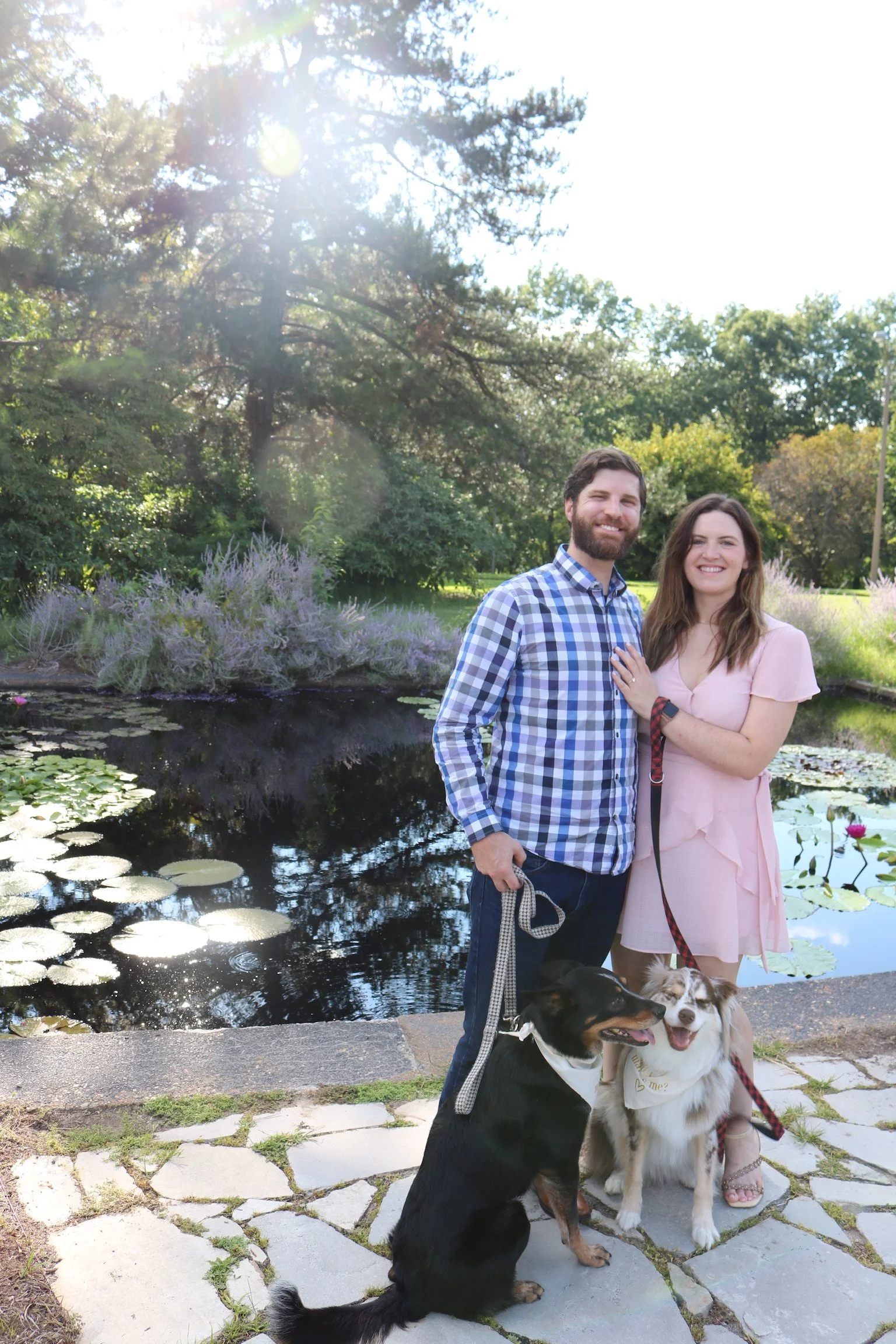When she arrived at the Jewel Box, Patrick was waiting with their two pups by the sundial. The late afternoon light made the glass building glow. The dogs were bursting with excitement to see her, and Shelby could barely process the moment before Patrick began his proposal. Overwhelmed with joy (and tangled in two leashes), she blurted “Yes!” before he could even finish asking.